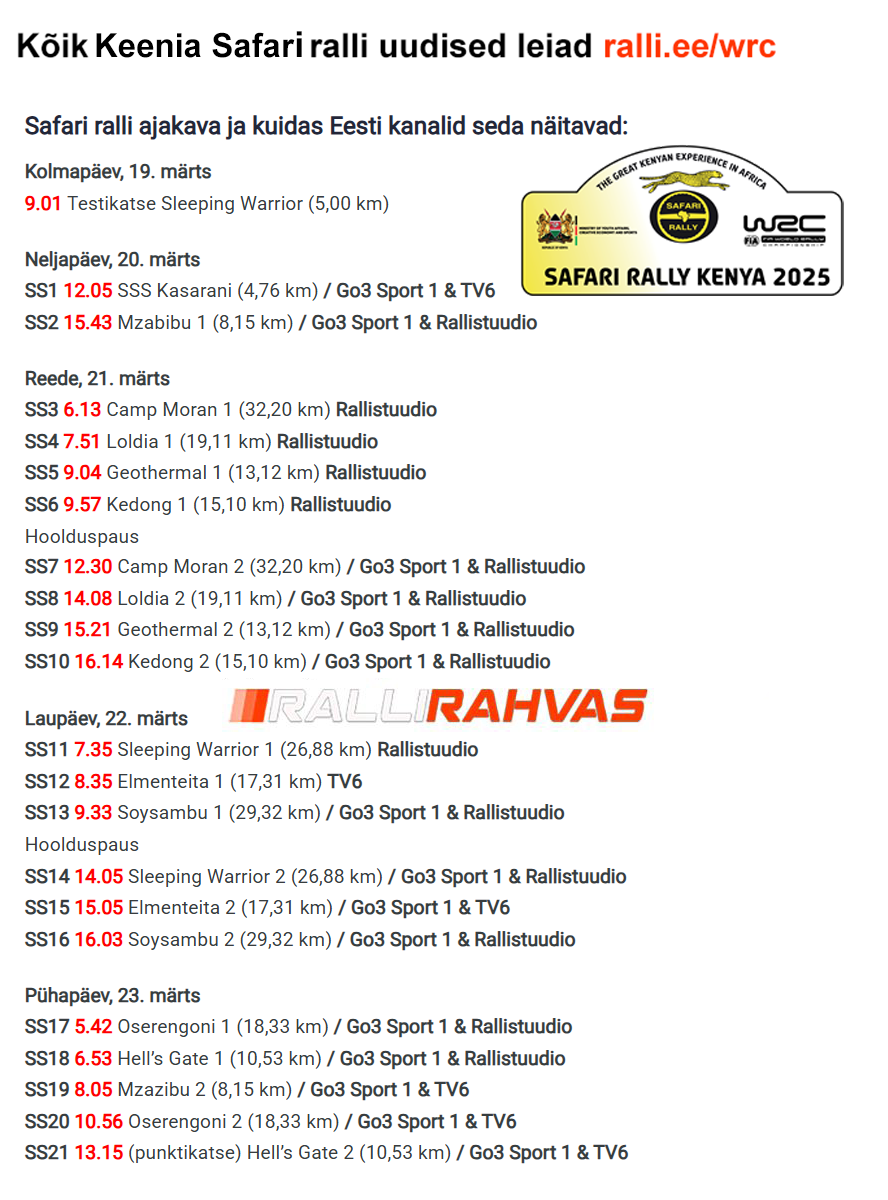 SS20 Oserengoni 2 (18,33 km) – 11.07 GO3 Sport1; TV6